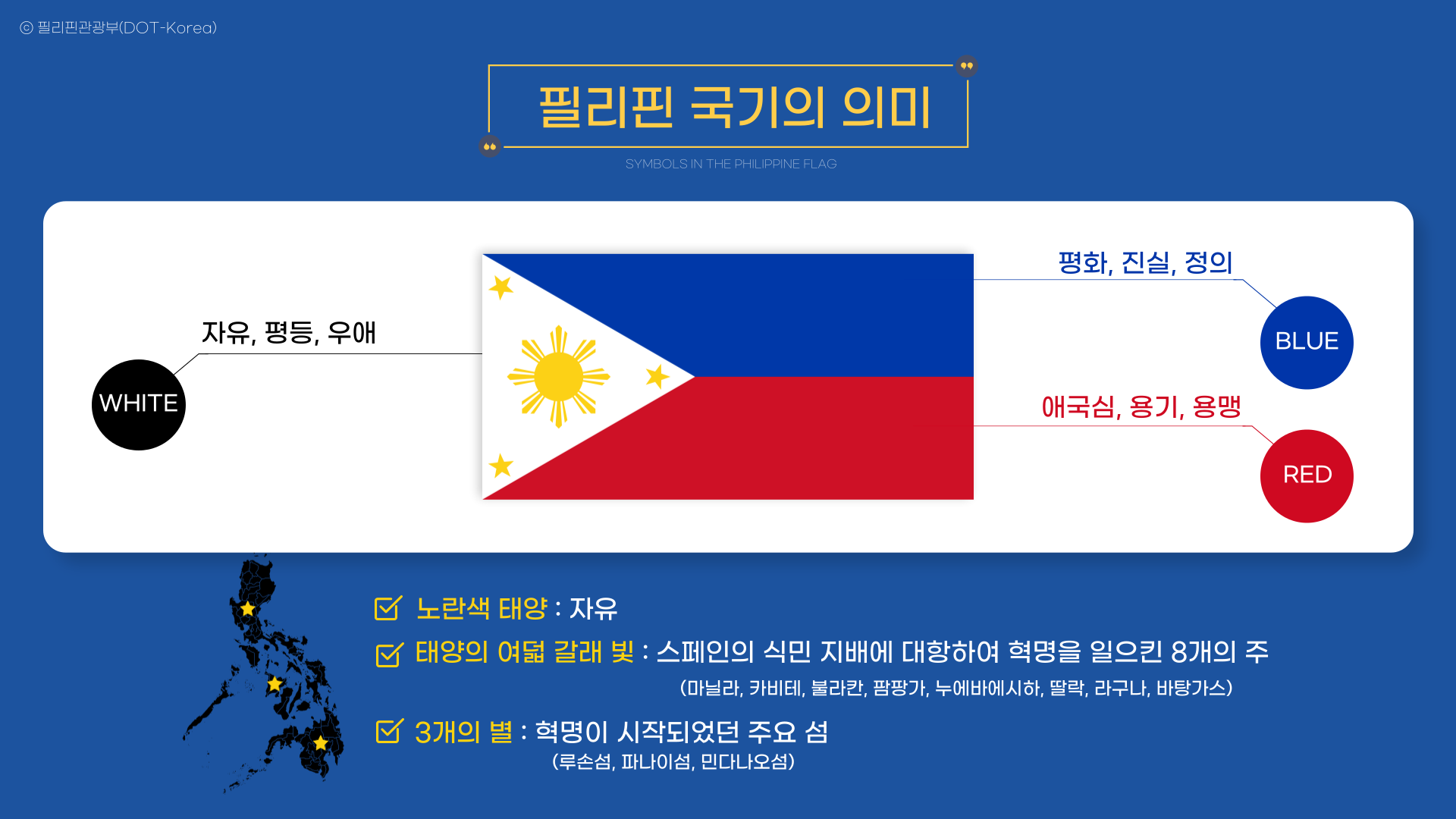필리핀국기의 중앙 상단에는 5각 별이 그려져있는데 이것은 아시아 대륙과 태평양을 상징하며, 다섯 개의 별은 각각 남중국해, 인도양, 동태평양, 서태평양, 북태평양을 나타냅니다. 그리고 왼쪽 위 모서리의 노란색 태양은 에스파냐로부터 독립하기 위해 투쟁하던 필리핀 민족의 단결을 나타내고 오른쪽 아래 구석의 파란색 타원형 안의 문장은 두 마리의 사자가 서로 마주보고 있으며 위쪽 사자는 부정부패와의 투쟁을 아래쪽 사자는 정의 수호를 뜻합니다.