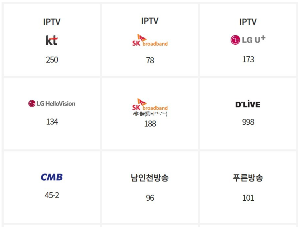 | 프로그램 | IPTV 채널번호 | 지역방송 채널번호 |