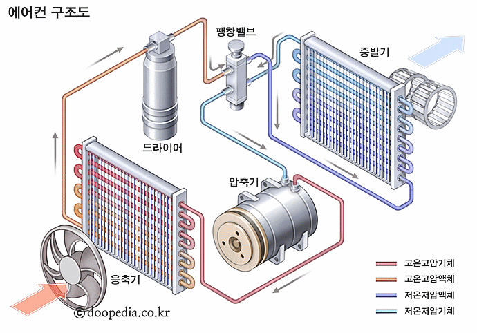 - 압축기에서 냉매는 다시 압축되면서 고압 가스 상태로 되돌아가게 되고, 이후 다시 팽창과 열 흡수 과정을 반복하며 계속해서 냉방 작용을 수행합니다.