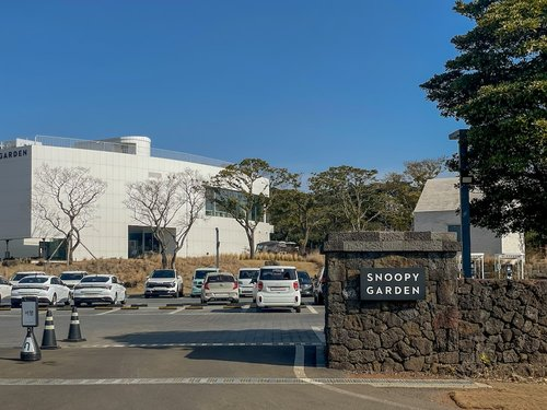 엘리베이터를 이용하여 루프탑까지 올라가면 좋은 안내를 받을 수 있습니다. 워터풀 뒤에는 인공정원인 오름정원이 위치하고 있는데, 이 곳은 멋진 전망을 즐길 수 있습니다. 먼 곳에 보이는 산은 군산과 산방산으로 생각됩니다.