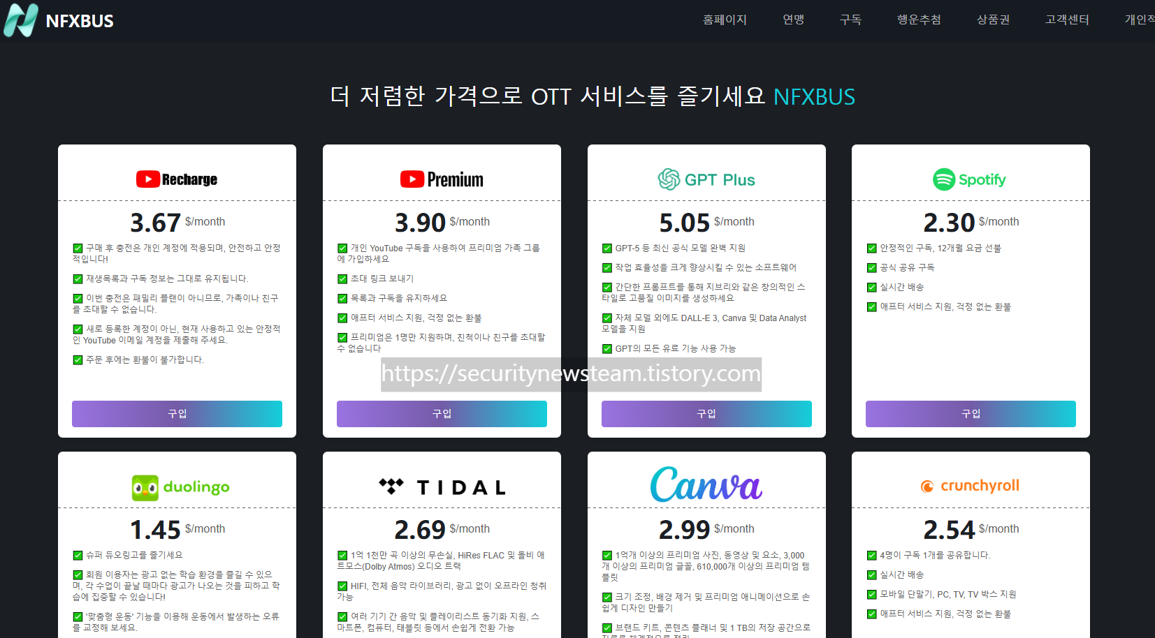 NFXBUS는 유튜브 프리미엄뿐만 아니라 GPT 플러스, 스포티파이, 듀오링고, 크런치롤 등 다양한 구독형 OTT 서비스를 한국 정식 출시가의 약 1/4 수준 가격에 제공합니다. 서비스 방식은 보통 한 계정의 프로필을 여러 사용자와 공유하거나, 가족 요금제 권한을 함께 사용하는 형태로 운영되어 상대적으로 저렴하게 이용할 수 있습니다.