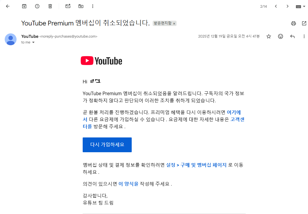 구글의 계정 단속으로 유튜브 프리미엄 결제수단 최신화 되고 맴버십이 취소되었는데....