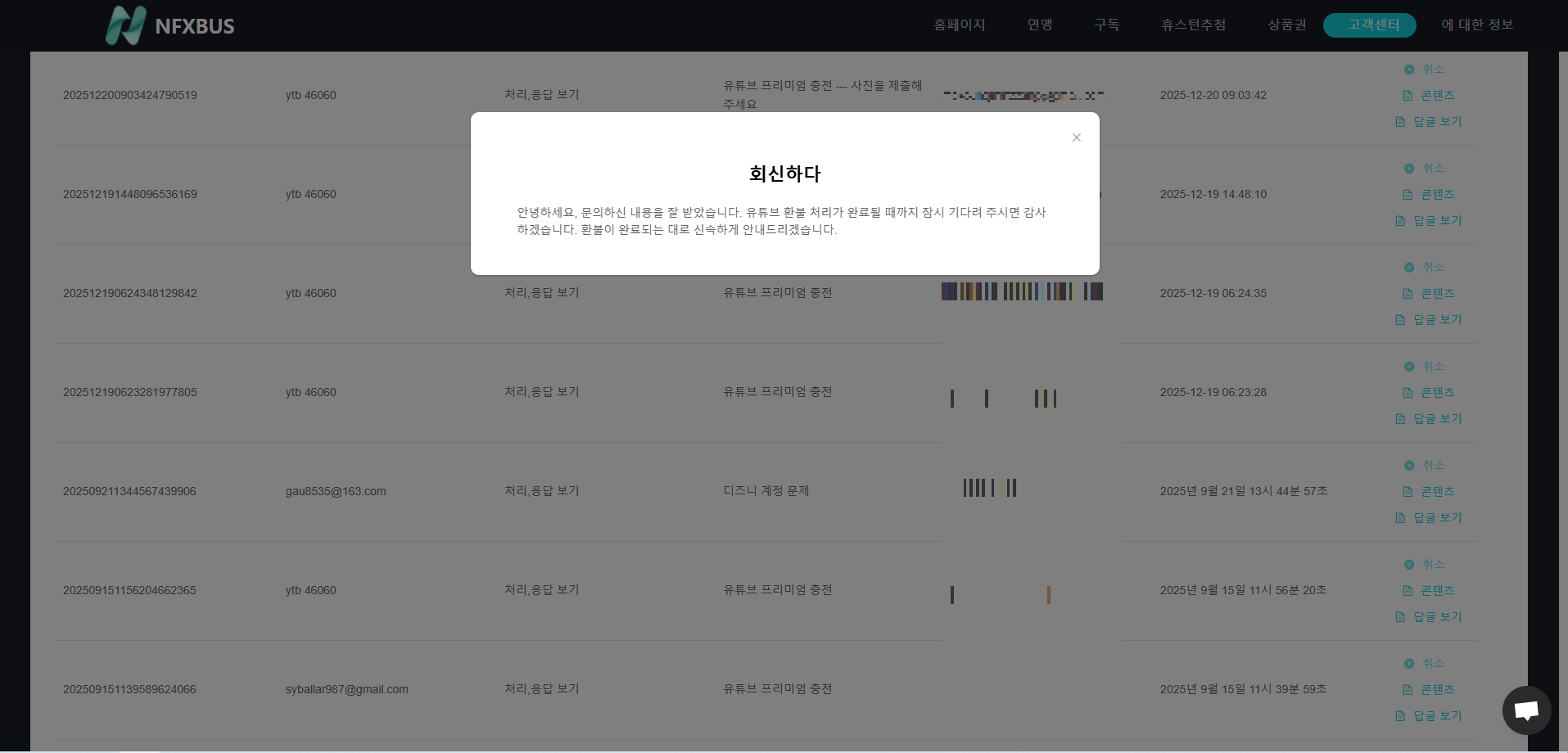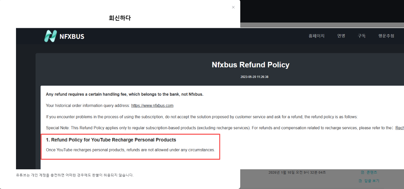 그로부터 1달간 집요하게 NFXBUS 문의결과, 본인들이 충전한 유튜브 프리미엄 서비스가 아직 환불처리가 되지 않았다면서 기약없는 기다림을 강요받게 되는데......